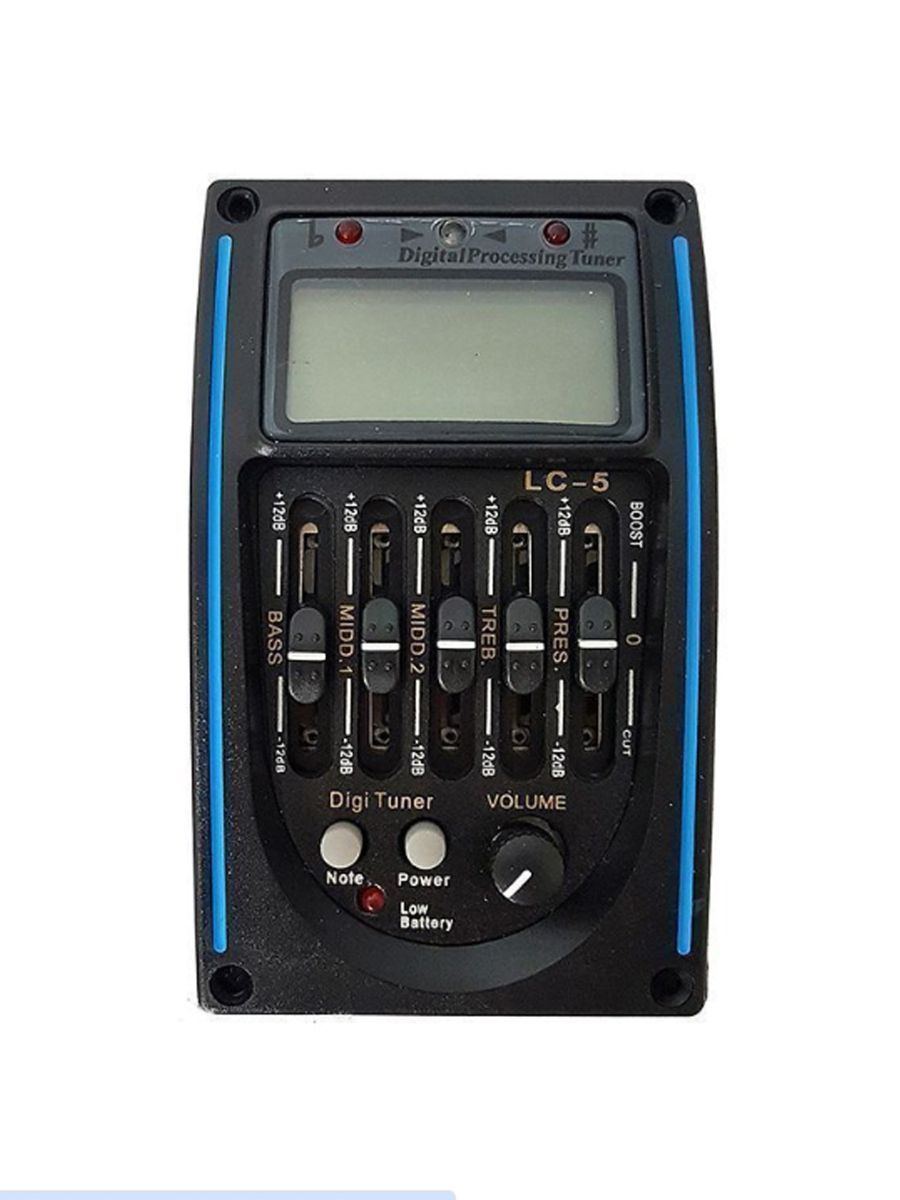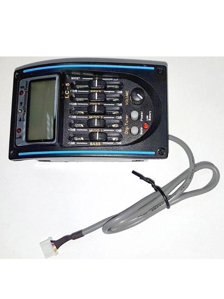 BaggZ LC-5 – отличный звукосниматель с пятиполосным эквалайзером, тюнером и батареей. Модель подходит для классических и акустических гитар. Особенности модели: – 5 полос эквализации – регулировка уровня громкости, низких, средних и высоких частот, яркости звучания – функция реверса фазы для подавления обратной связи – соединительные провода и батарея в комплекте – размер 57х95х44 мм Модель BaggZ LC-5 очень легко вмонтировать в корпус инструмента. Пять полос эквализации помогут быстро преобразить звук и подавить обратную связь. Встроенный тюнер с большим ЖК-дисплеем позволит вам без труда настроить инструмент.   Эквалайзер BaggZ LC-5 позволит вам быстро настроить гитару и сделать ее звучание мощным, объемным и качественным.