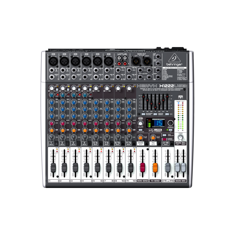 Микшерный пульт XENYX X1222USB – выбор тех, кому нужен чистый сбалансированный звук в режиме «реального времени». Оснащённый не только средствами настройки, но и инструментами контроля за звучанием, XENYX X1222USB может похвастаться чрезвычайно низким уровнем шумов и артефактов даже при работе в не лучших с точки зрения акустики помещениях. XENYX X1222USB имеет 4 монофонических входных разъёма, 4 стереофонических, а также 6 микрофонных входов с предусилителями, обеспечивающими динамический диапазон 130 дБ, и фантомным питанием 48 V, делающим микшер пригодным для использования с микрофонами и динамического, и конденсаторного типа. Моноканалы оснащены фильтрами низких частот, в большинстве случаев решающими проблему паразитарных шумов ещё на уровне входного сигнала. Компрессоры на монофонических каналах позволяют достичь ещё лучшего качества аудио, выравнивая значительные перепады интенсивности и нормализируя сигнал. Первичная настройка звучания производится 3-полосными канальными эквалайзерами.