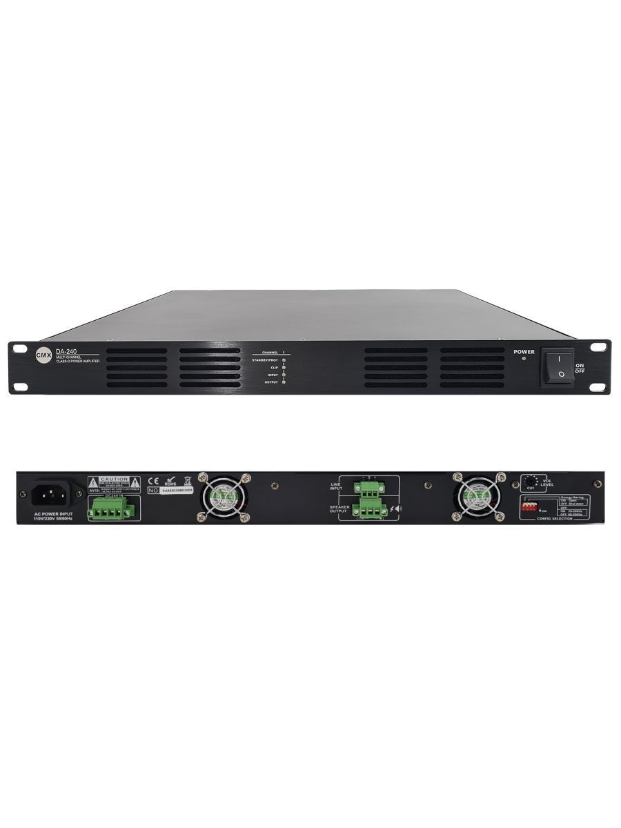 CMX Audio DA-240 – это высококачественный одноканальный усилитель класса D. Особенности модели: – импульсная технология питания – минимальное энергопотребление – высота 1RU для меньшего пространства в стойке и меньшего тепловыделения – каждый вход с отдельной регулировкой усиления – каждый канал с высокочастотным фильтром – встроенная функция автоматического ожидания для экономии энергии – отдельные индикаторы для защиты, закрепления, ввода и вывода – полная защита от короткого замыкания, перегрузки, высоких температур, зажимов и постоянного тока – широкий вход переменного тока, переключаемый между 115 В и 230 В Модель CMX Audio DA-240 прекрасно подходит для использования как в громкой связи, так и в профессиональной аудиосистеме.
