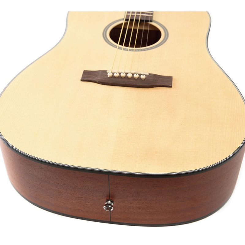 Полноразмерная акустическая гитара SX SD304 представляет собой качественный инструмент, который одинаково хорошо подойдет как для начинающих, так и для продвинутых гитаристов. SX SD304 – это воплощение изысканной простоты и элегантности. Инструмент выполнен в натуральном цвете с матовой отделкой. Верхняя дека изготовлена из ели, которая делает звучание гитары ярким и звонким. Нижняя дека из махагони обеспечивает отличный резонанс. Хромированные колки прекрасно держат строй. На корпусе гитары расположены два хромированных держателя, которые позволяют быстро и надежно закрепить ремень или шнур. Инструмент рассчитан на установку металлических струн. Акустическая гитара SX SD304 – превосходный инструмент, который приятно удивит вас не только отличным звучанием, но и привлекательной ценой.